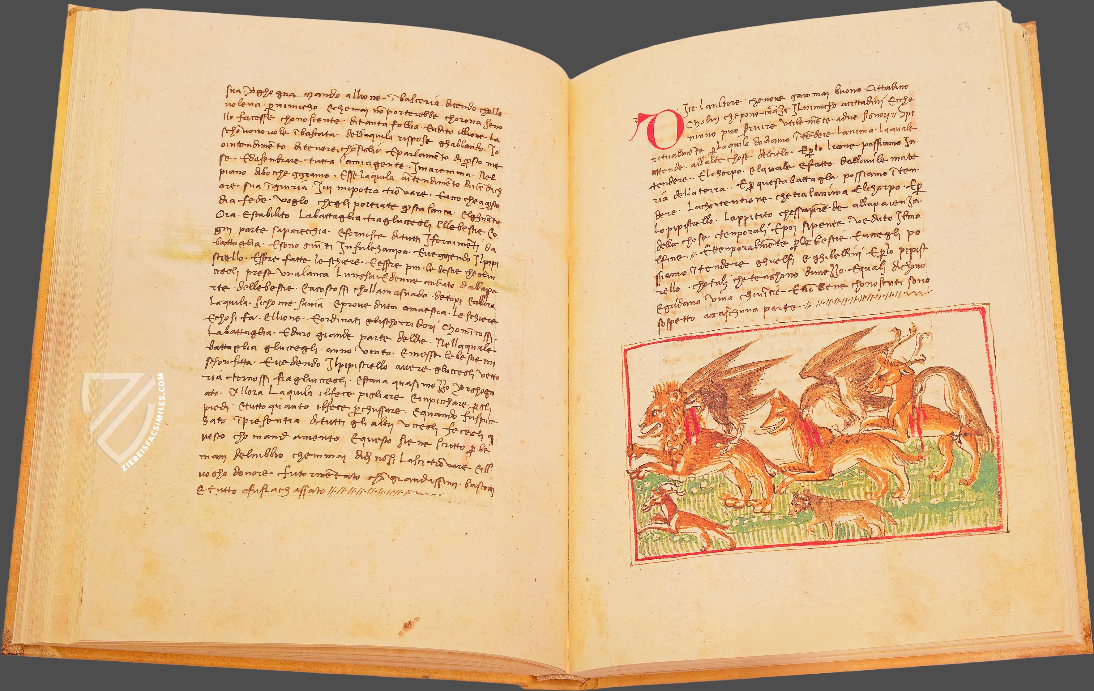 The so-called Udine Aesop is a remarkable literary and artistic testimony to 15th-century Tuscan civic lay culture. The manuscript contains a collection of free Italian translations and adaptations of several moralizing and edifying works by classical and medieval authors such as Seneca, Cato, and Bernard of Clairvaux, with Aesop's famous fables making up the majority of the text. They dominate the codex not only in terms of length, but also because of their striking illumination, which is absent from the other parts. Almost every fable is accompanied by a large, page-wide washed pen-and-ink drawing. The 64 miniatures depict scenes from the respective fables in a sketchy, folkloristic manner, characterized by expressive animal depictions, people in rustic clothing, and vivid gestures. Despite their simplicity, these extensive illustrations are highly remarkable for a vernacular text. Francesco Orlandi, who created both the text and the miniatures, deliberately distanced himself from the elegant court art of the time and instead implemented an independent book art that reached its middle-class lay readership in a much more accessible way.