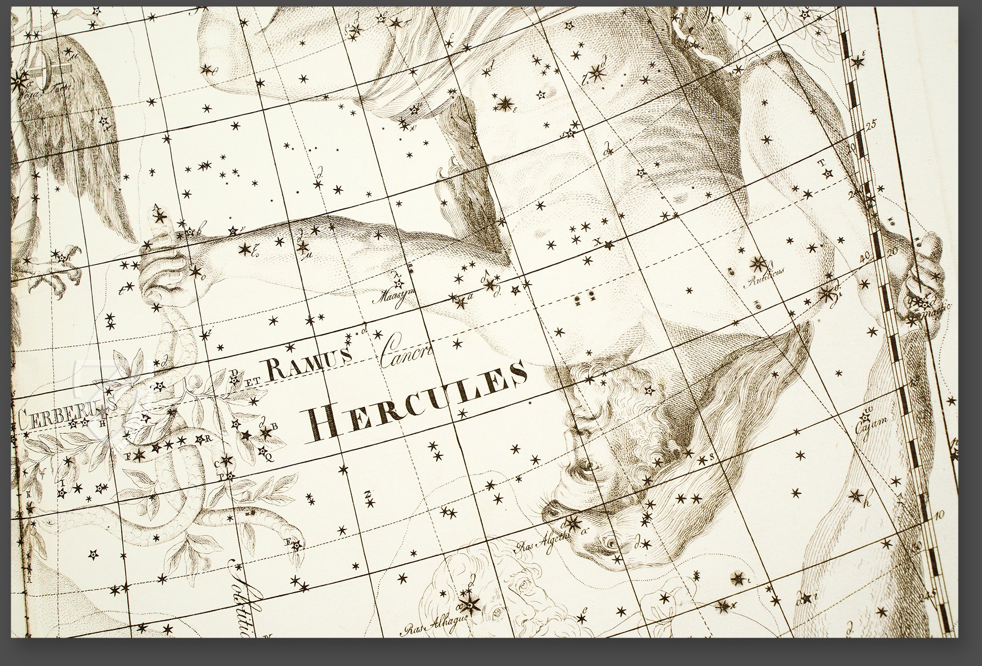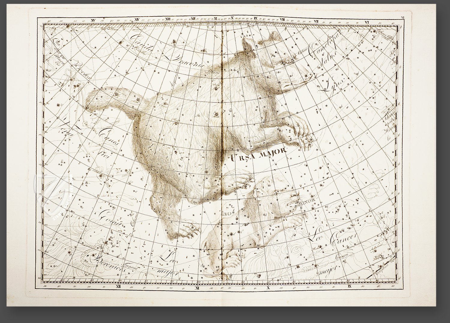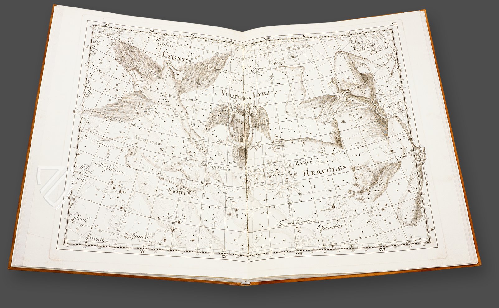 The Uranographia is one of two star atlases that Bode published and is by far his most important work. He depicted his astronomical findings and his scientific research in a grateful, artistically pleasing manner. His star constellations are deposited with visual interpretations of people, animals, and celestial phenomena. The printed book, whose style corresponds completely to the scientific spirit of Renaissance humanism, was bound in a special manner. The pages were stuck to the book spine in such a way that one can open the book completely and spread it flat. Consequently, every detail of the astounding star maps are visible. Bodeâs artistic atlas is the most masterful and simultaneously the last of of its genre ever to be printed.