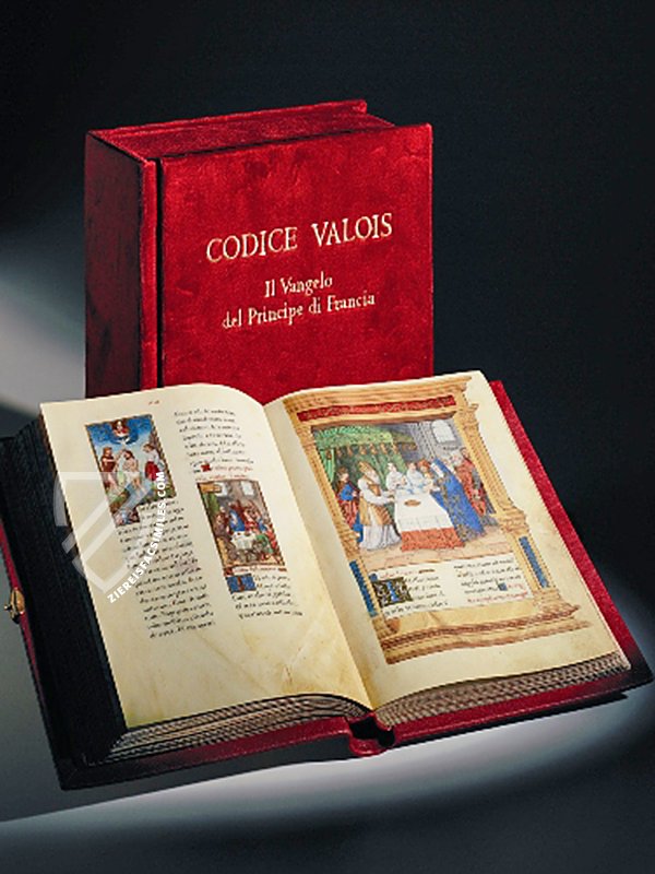 The so-called Valois Codex, also known as Casanatense Evangeliary, is a truly historical witness to an exciting and suspenseful chapter in Franco-Spanish history: the hostage-taking of the two sons FranΓ§ois and Henri of the French King Francis I (1494-1547) and his wife Claude de France (1499-1524) after the Battle of Pavia by Emperor Charles V (1500-1558). During his four-year captivity in Spain, this gospel book served the eight-year-old heir to the throne and Dauphin FranΓ§ois de France (1518-1536) as a precious piece of educational material. It was a gift from his mother Claude and probably originated around 1526 in Tours, where the French queen commissioned many famous manuscripts. Grandiose full-page miniatures and numerous smaller images decorate the ornate gospel book in a child-friendly way and at the same time make it an outstanding masterpiece of French Renaissance painting!