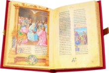 Numerous full-page miniatures adorn the 312 pages of the gorgeous manuscript. The biblical stories were told in depictions that are both suitable for children and are simultaneously paintings of the highest quality. Alongside the outstanding quality of the paintings, the pictorial inventions and considered compositions of the miniature pages are especially impressive, e.g. the grandiose arrangements of the frames around the miniatures. These imitate Renaissance architecture in an exceptional manner. Alongside the full-page miniatures, one additionally finds 96 small, precious pictures in the text.