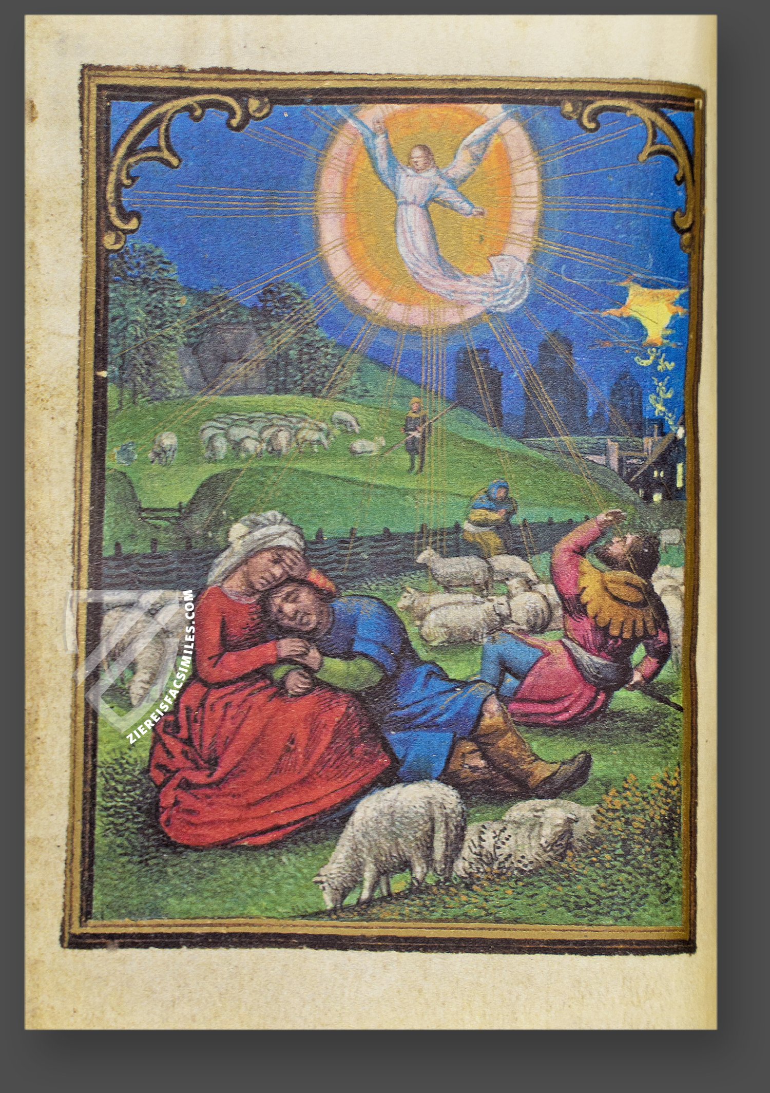 The moment of the angel’s appearance in the sky is depicted in incredible detail considering that this page could barely cover the palm of one’s hand. Such is its majesty that the shepherds have to shield their eyes from the golden rays that illuminate the night’s sky. Simon Bening innovatively incorporates a close up in the foreground of this impressive landscape to convey a sense of surprise and wonder.