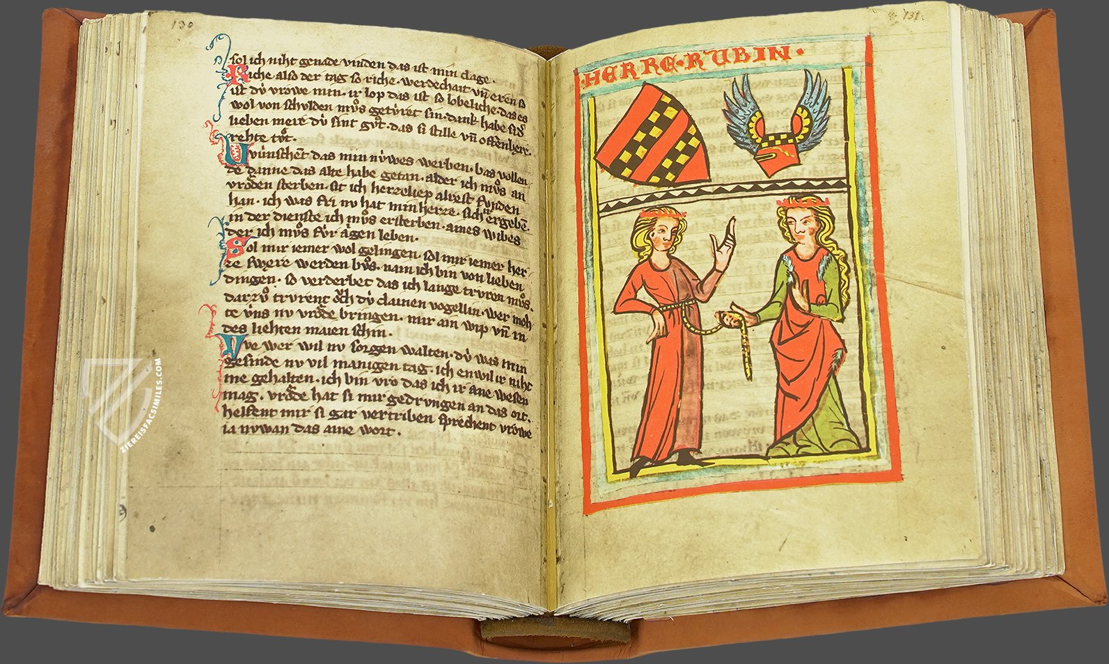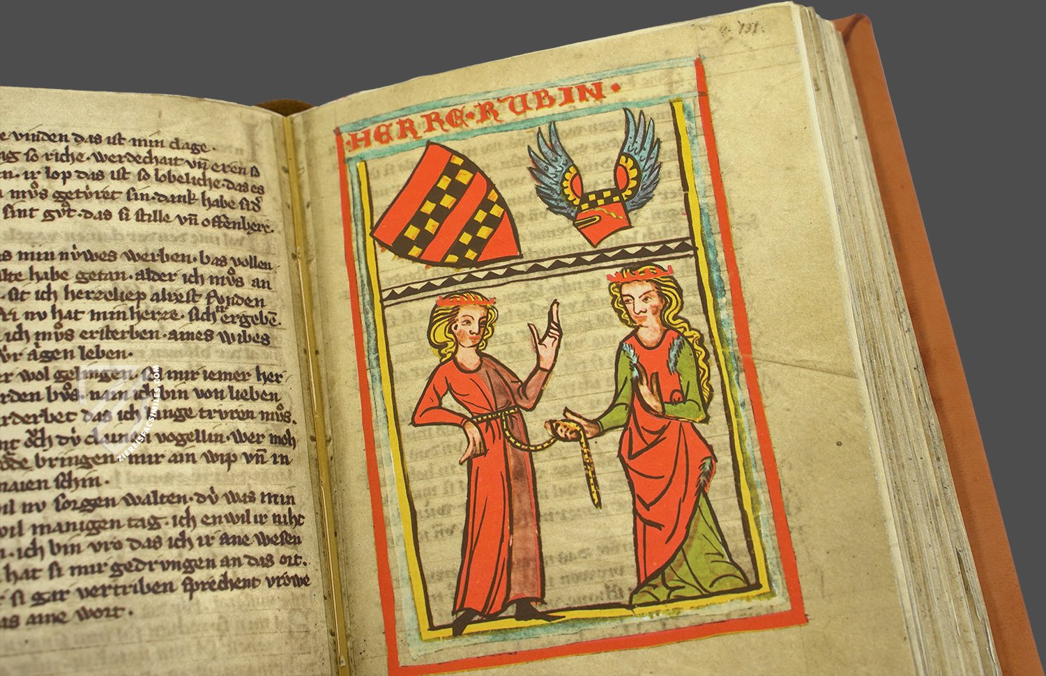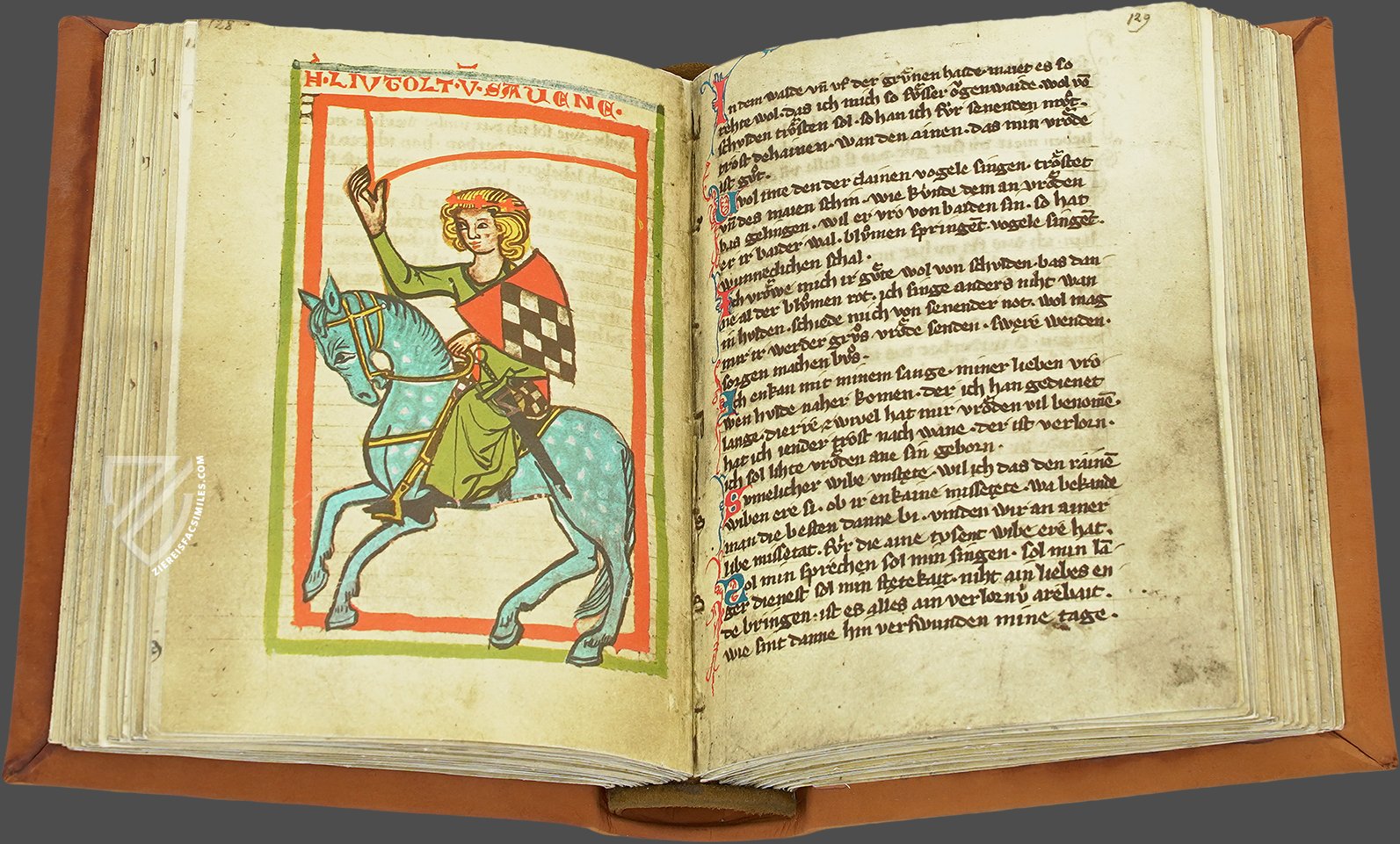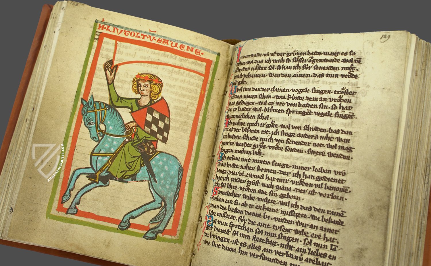 This fine specimen of Minnesang, the German version of the medieval troubadour tradition, is believed to have originated from the region of Konstanz in the early–14th century. It is one of the most important artifacts of this tradition and has the works of 31 poets working in Middle High German. Mostly from an aristocratic background, these poets even include Holy Roman Emperor Henry IV, whose compositions are found in the beginning of the codex.
