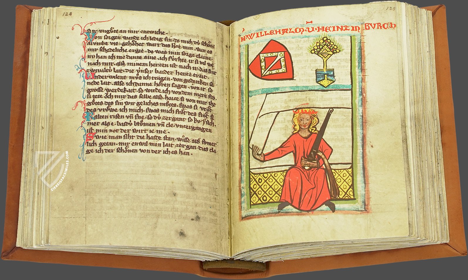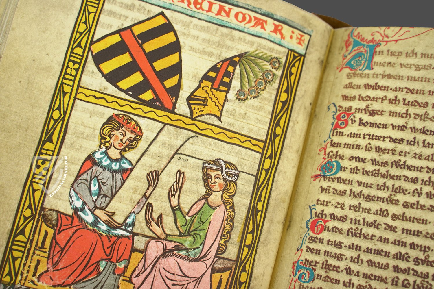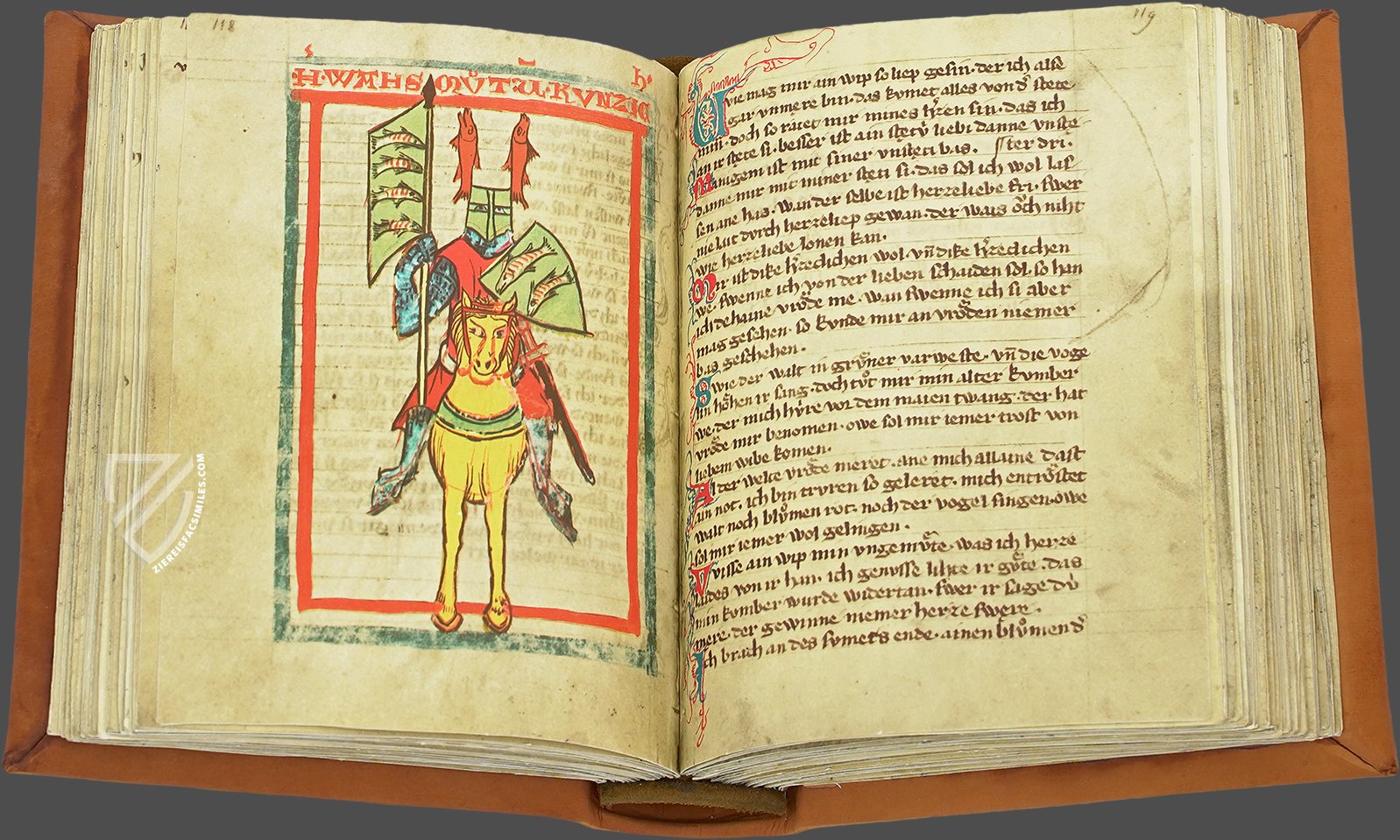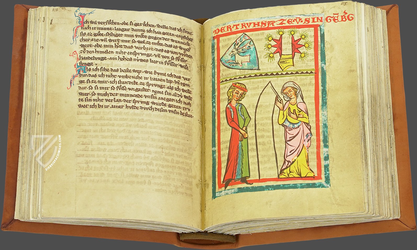 This fine specimen of Minnesang, the German version of the medieval troubadour tradition, is believed to have originated from the region of Konstanz in the early–14th century. It is one of the most important artifacts of this tradition and has the works of 31 poets working in Middle High German. Mostly from an aristocratic background, these poets even include Holy Roman Emperor Henry IV, whose compositions are found in the beginning of the codex.