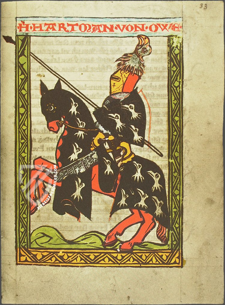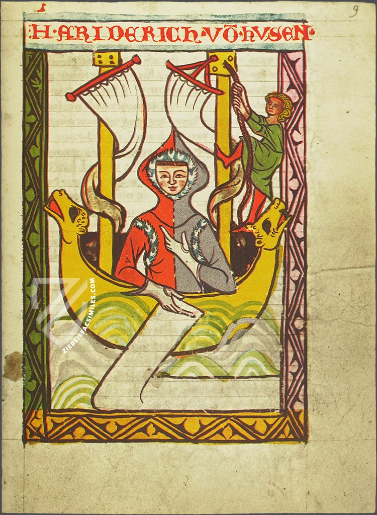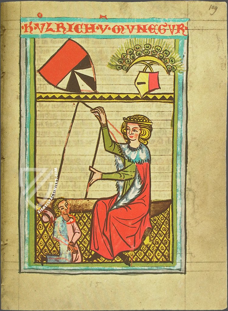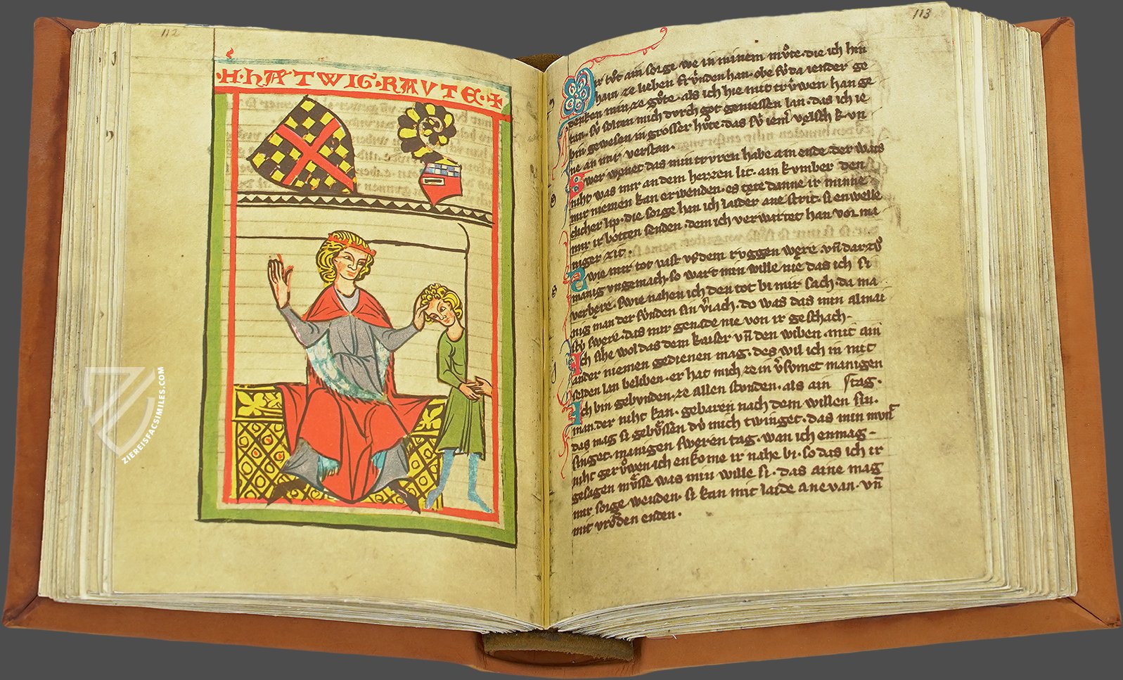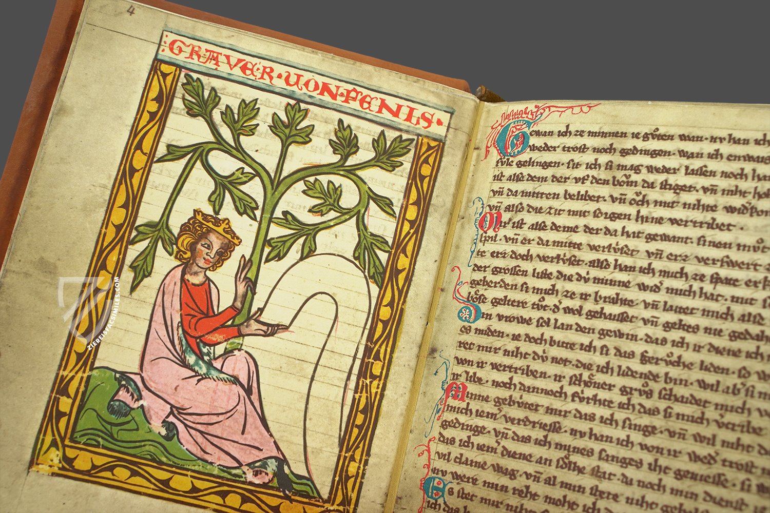 This fine specimen of Minnesang, the German version of the medieval troubadour tradition, is believed to have originated from the region of Konstanz in the early–14th century. It is one of the most important artifacts of this tradition and has the works of 31 poets working in Middle High German. Mostly from an aristocratic background, these poets even include Holy Roman Emperor Henry IV, whose compositions are found in the beginning of the codex.