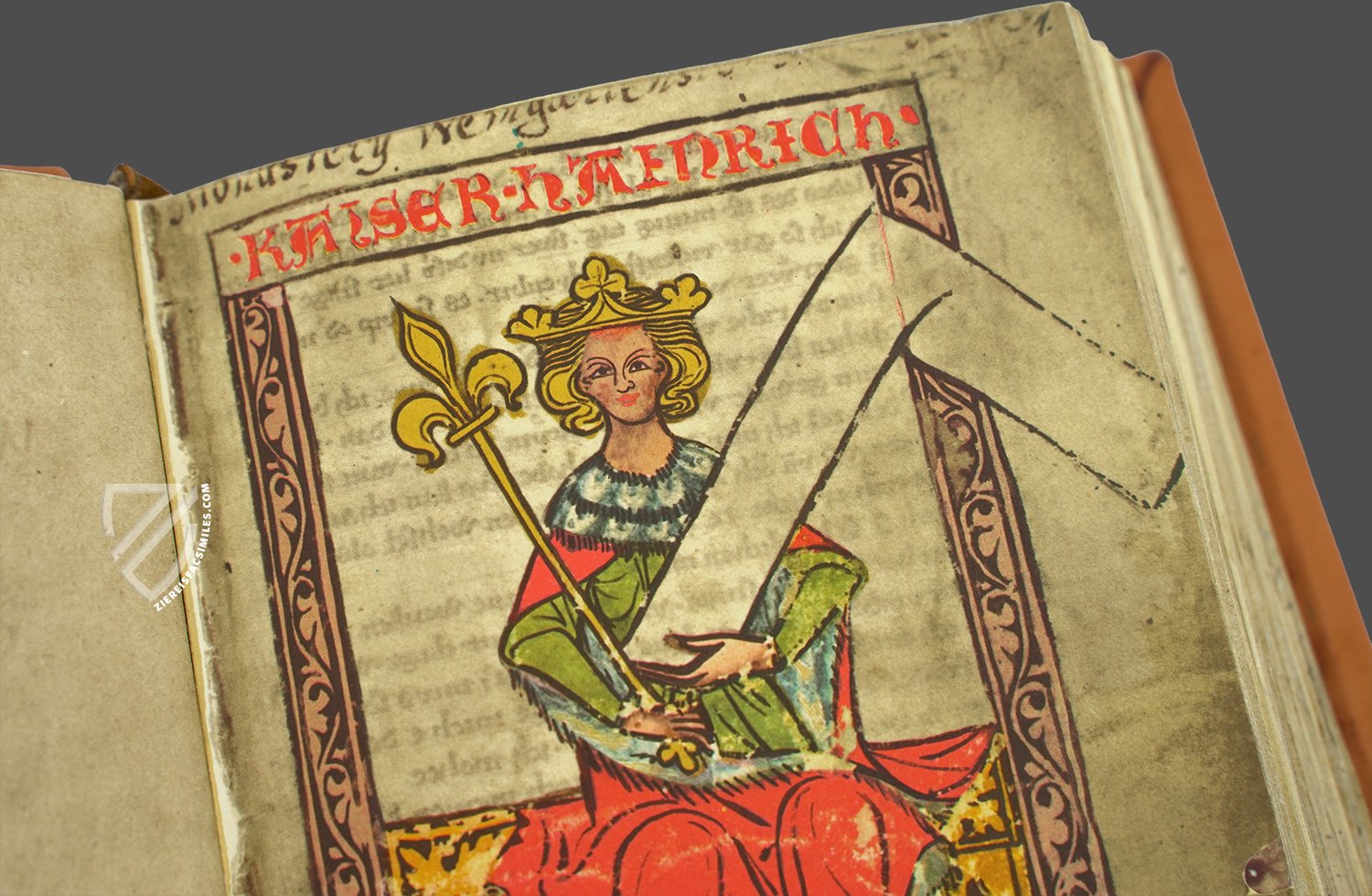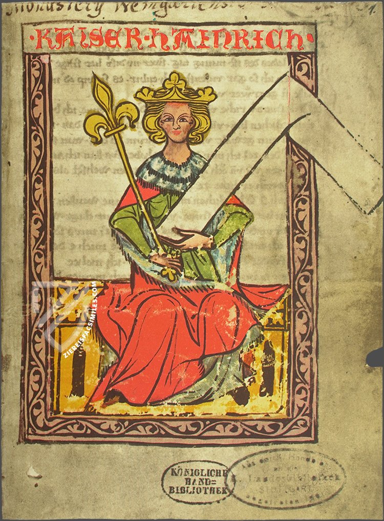 In addition to the song Kaiser Heinrich presented in this manuscript, at least three poems have been attributed to Henry VI, which were written when he was a young man in love. As such he is presented here as a fresh-faced youth. One of his poems describes a lady who means more to him than all the power, wealth, and dignity of his crown, which he would sooner give up than her.