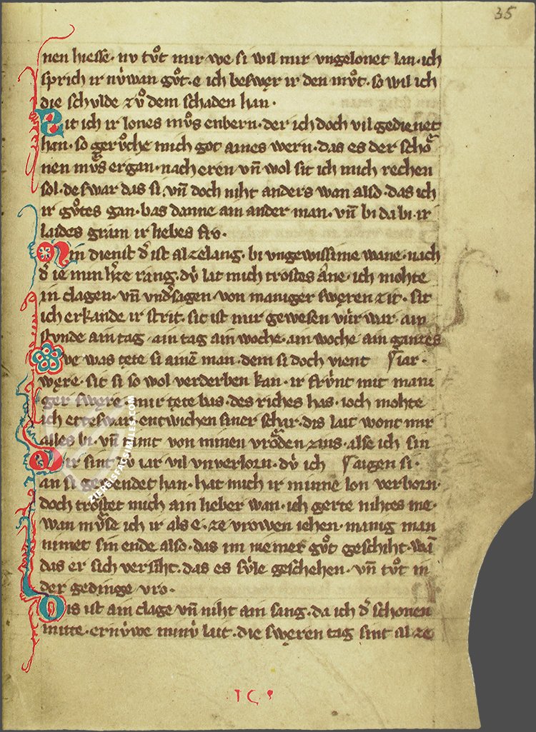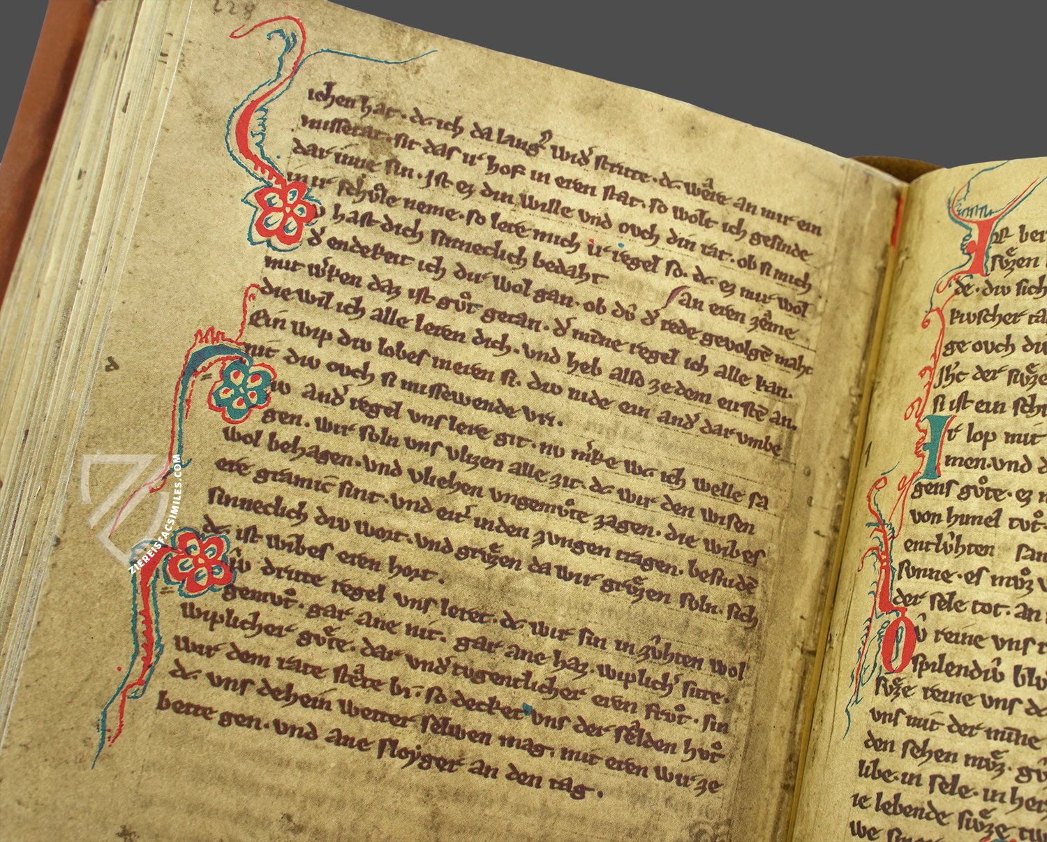 Here we have one of the most important sources of Minnesang, the Middle High German tradition of lyric- and songwriting originating from the 12th to the 14th centuries. The primary subject of these songs was Minne, a Middle High German word for love. Individual songs were called a Minnelied and were performed by a Minnesänger, the German equivalent of a troubadour. Known as the Weingarten Manuscript, it is one of this tradition’s three major manuscripts along with the Codex Manesse and Kleine Heidelberger Liederhandschrift. It contains texts from the golden age of Minnesang and is stored under the shelf mark XB XIII 1 in the Württembergische Landesbibliothek, Stuttgart.