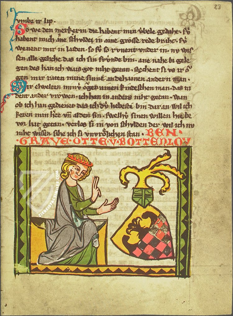 Spelled here as “Botenlouben”, Otto von Botenlauben (1177–1245) was Count of Henneburg, a Crusader knight, and a minnesinger. In 1231, he and his wife Beatrix de Courtenay founded the Cistercian cloister of Frauenroth, where they are buried. He was an adherent of Emperor Henry VI, a fellow minnesinger, and participated in the Emperor’s Italian campaign in 1197. Otto is depicted sitting across from his coat of arms and gesturing with long fingers as though reciting one of his compositions.