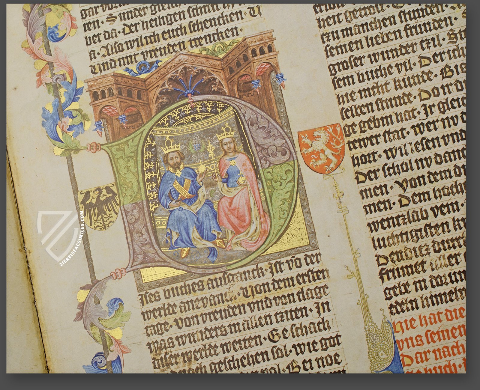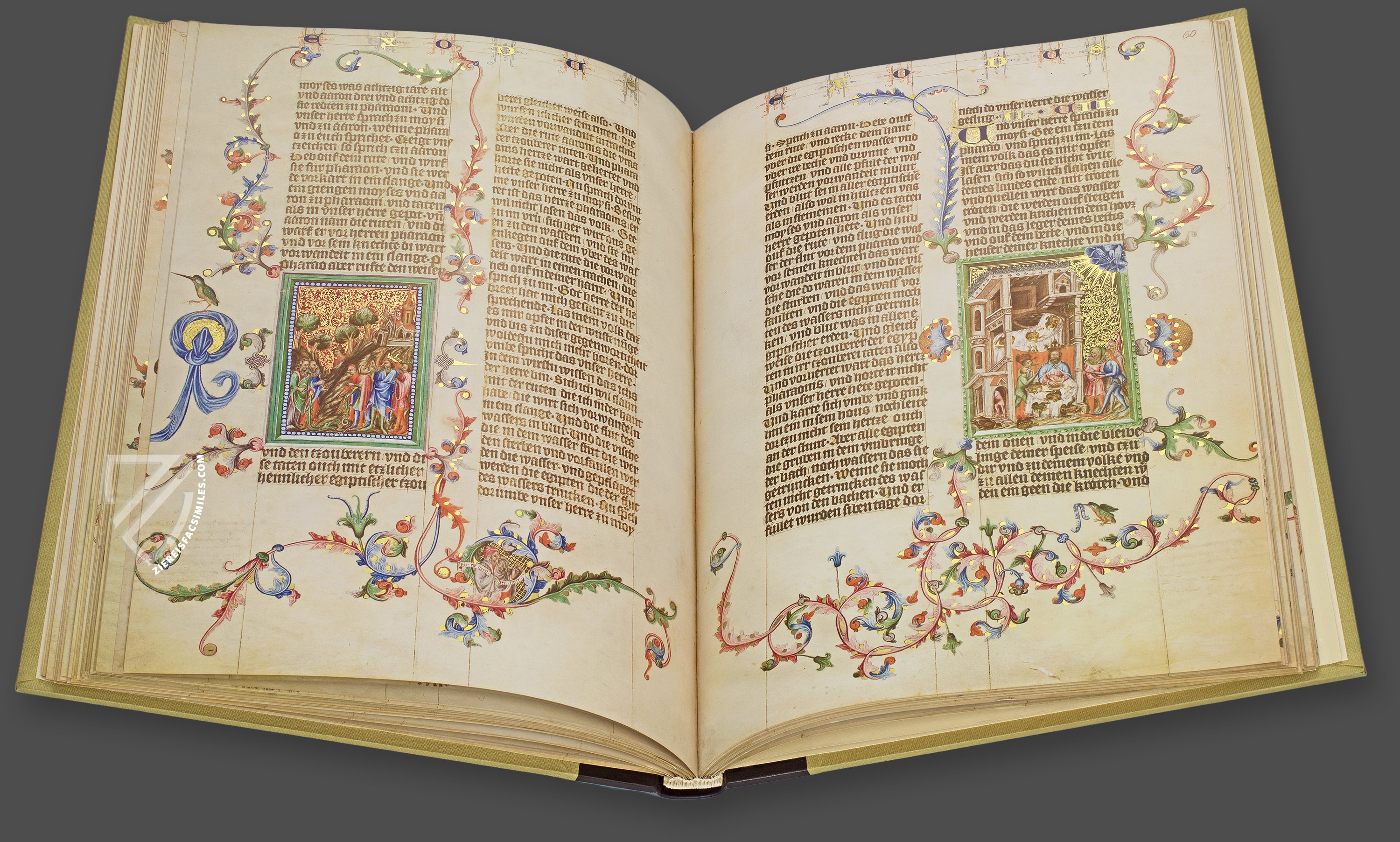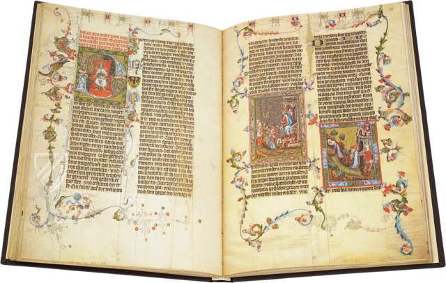 Almost 150 years before Luther’s translation of the Bible was first published, one of the most reputed schools of illumination in Prague produced the first German deluxe Bible manuscript. The Wenceslas Bible, with its 646 miniatures and rich, frequently symbolical and narrative marginal decoration, was written at the behest of King Wenceslas IV of Bohemia between 1390 and 1400. Words are insufficient to describe the elaborate, extremely lavish decoration of this luxury Bible. Wenceslas summoned the best illuminators of Europe to his court in Prague where they created this unique manuscript. Unfortunately, the artists have all remained anonymous.