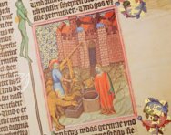 The marginal decorations of the Wenceslas Bible are almost as fascinating as its miniatures. These drolleries are characterized by an unmistakable sense of humor. Among the main protagonists, one finds a girl dressed in a short, shirt-like garment whose attributes – a bucket and a sponge – identify her as a bathing maiden. She is accompanied by a male figure, probably King Wenceslas himself, who frequently appears captured in the letters W and E. In addition, countless allegorical creatures, such as the wild man or the kingfisher, roam throughout the book.