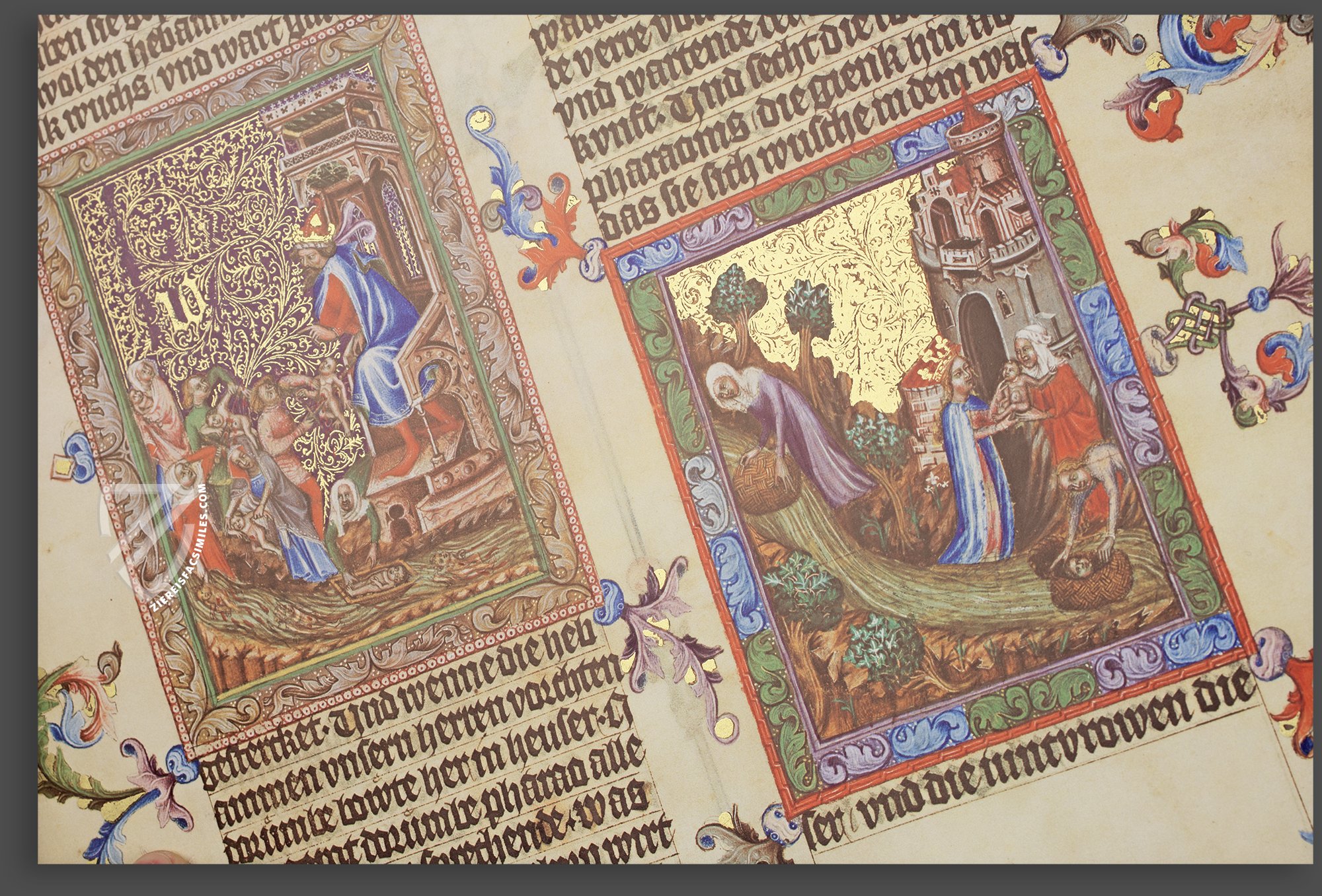 This beautiful Gothic miniature depicts how Moses’ mother saved him from the slaughter of male Hebrew children that had been ordered by Pharaoh. “Then the daughter of Pharaoh came down to bathe at the river. And her maidens walked along the riverside; and when she saw the ark among the reeds, she sent her maid to get it. And when she opened it, she saw the child, and behold, the baby wept. So she had compassion on him, and said, ‘This is one of the Hebrews’ children’.” (Ex. 2:5-6)