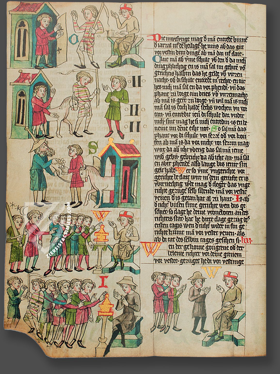 Over 450 preserved manuscripts and fragments in existence today show the extreme importance of the Sachsenspiegel in public life during this time. Found among them are four especially brilliant illuminated codices whose text is accompanied throughout by splendid pictures that clarify the given text. The boundless wealth of information about the daily life of both knight and peasant and the enormity of details regarding their everyday routine make these manuscripts a virtually inexhaustible source of knowledge for cultural history in general and the Middle-Ages in particular. The four codices derive their names from the places where they are stored. The Heidelberger Illustrated Manuscript dates from around 1300 â it is an assortment of 30 pages with 310 pictures and is maintained only in fragments. The Oldenburger Sachsenspiegel, dated 1336, offers the most complete text of the four codices but only 44 of the 578 hand-painted pictures remain preserved with intact colors. The rest contain only colorless outlines of figures and objects. However, from an especially artistic point of view and value, the other two manuscripts are the most important. Both the Dresdner Codex (dated from the midâ14th century) and the WolfenbĂŒttleler Sachsenspiegel (emerging a short while later) contain hand-painted pictures of the highest quality, which depict real-life scenes with animated facial expressions and gestures of the figures as well as a rich application of gold throughout.