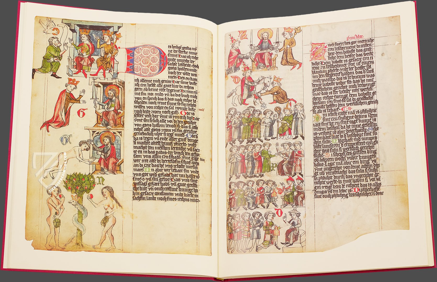 The WolfenbĂŒtteler Sachsenspiegel (Mirror of Saxony) is dated from the third quarter of the 14th century and is the youngest of four surviving illuminated manuscripts representing the most important German law book from the Middle Ages; the Sachsenspiegel. Only a small number of Codices come close to the outstanding quality of its painted-drawings and the extensive breadth of traditional text found in the WolfenbĂŒtteler Sachsenspiegel. Nonetheless, even these codices cannot compare with the perfect preservation of intense colors and gold contained in these hand-painted pictures. With the finest reception of the text and splendidly colored paintings, the WolfenbĂŒtteler is without question the most precious example of illustrated codices of the Sachsenspiegel.