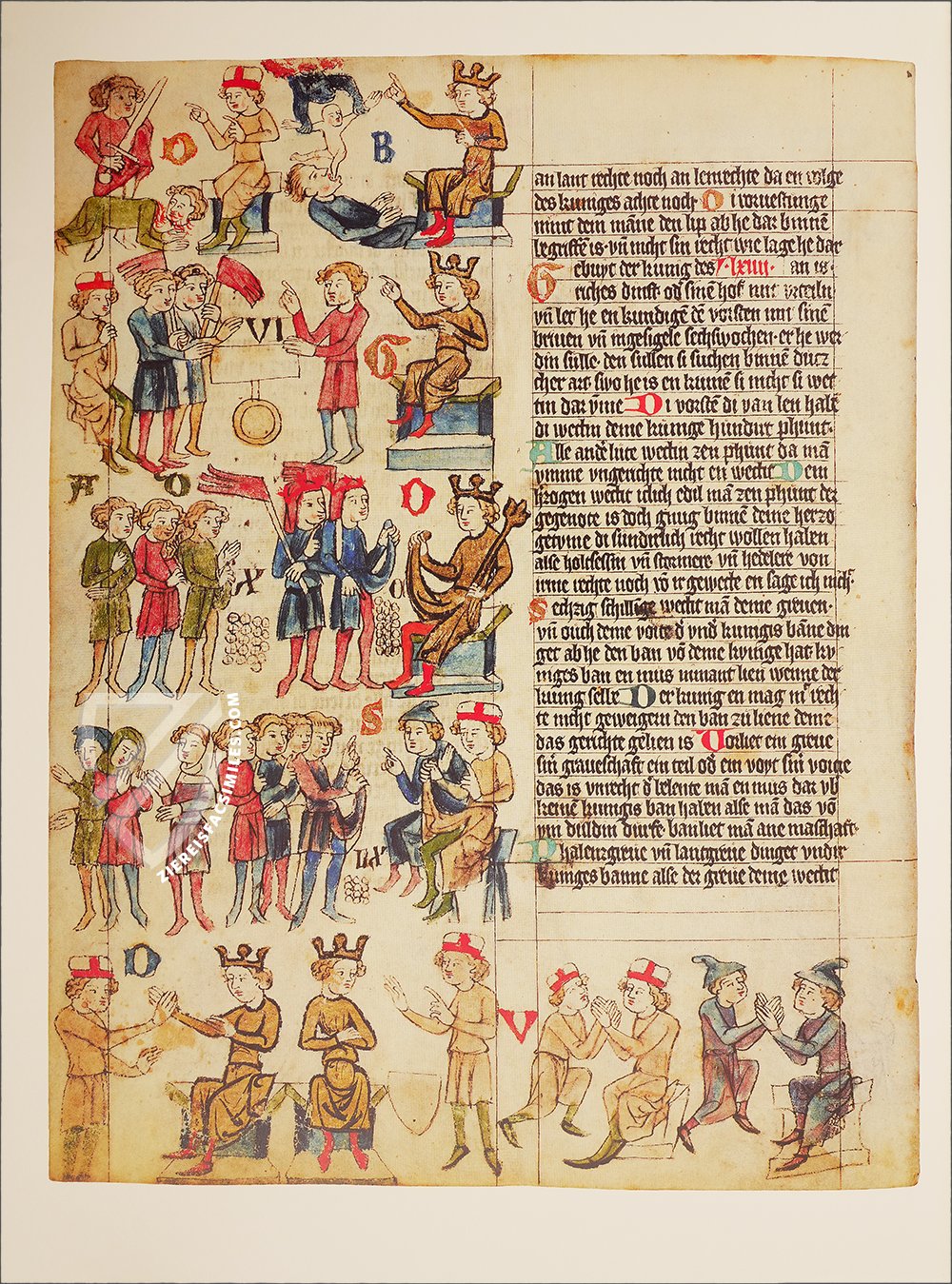 776 painted pictures are laid out over 86 pages unfolding a splendid, colorful panorama of the laws for everyday life in the 14th century before the reader. The paintings can be found on every page, on the left-hand side or beneath text where room allows. Since part of the painting envelops the first word in an accompanying text, the correlation between text and picture is easy to follow. Additionally, the pictures are more than merely beautiful illustrations but also help to clarify and give a better understanding of the text. Important cultural and historical significance is attached to the additional information found within the pictures themselves. The drawings depict individuals of differing social groups, interior and exterior architectures, weaponry, landscapes, household belongings, cuisine, and jewelry, all of which offer an invaluable source for further study and exploration of everyday life in the Middle-Ages.