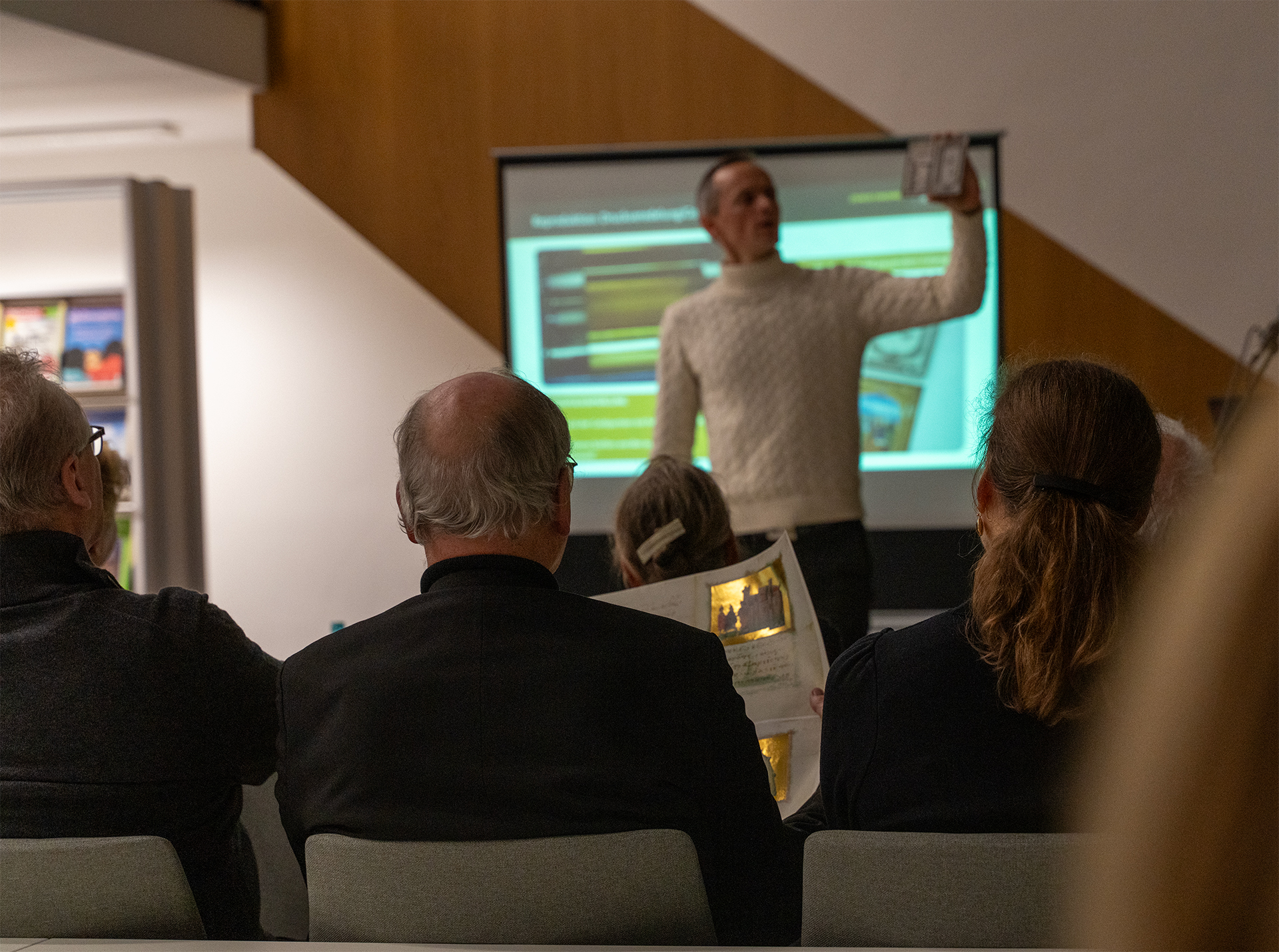 At the beginning of the lecture, Ms. Martin-Konle welcomed the about 70 guests and listeners and expressed her delight that for the first time since the start of the renovation and conversion work, it was once again possible to host lectures and exhibitions in the historic rooms of the library. She introduced the speaker Georg Ziereis as a world-renowned expert for facsimiles, mentioned the Ziereis brothers' many years of lecturing both in Germany and abroad and put the audience in the mood for the one-hour lecture before giving the floor to Georg Ziereis.